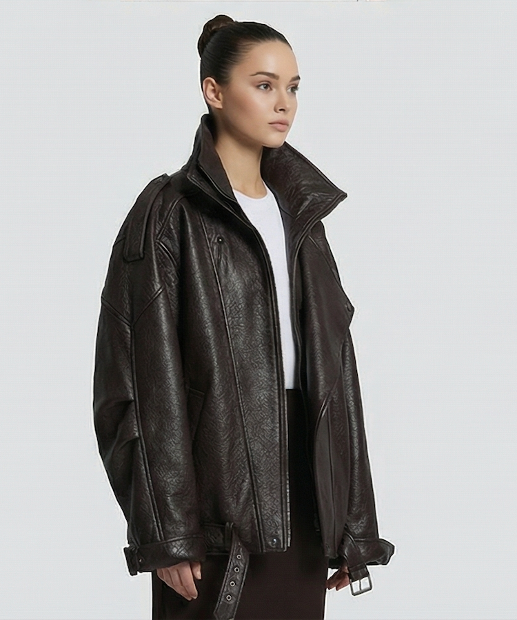 The Lou Leather Jacket brings a sculpted oversized silhouette with its wide collar, dropped shoulders and soft, textured leather finish. Designed for modern structure and effortless attitude, it elevates simple looks with understated edge.
