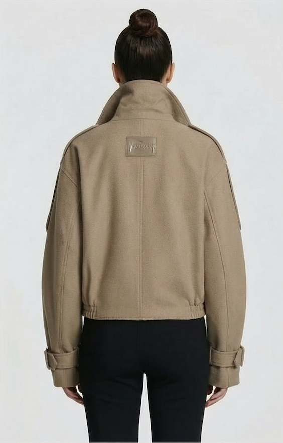 The Serena Trenchcoat updates a classic shape with softened volume and a sculpted high collar. Its cropped length, double-breasted front and clean tailoring create a bold yet refined silhouette that elevates everyday dressing.